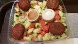 Six balls of fried chickpeas seasoned with a selection of Middle Eastern herbs and spices, on a bed of Cairo salad with crumbled feta cheese. Served with a side of pita bread and tahini sauce.